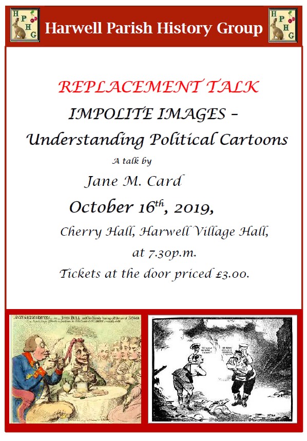 Hello. Charlie East is unwell, and upset at not being able to make this evening to give his talk. ( We will re schedule his talk on the Kennet and Avon Canal, which looked great.) So I am giving “Impolite Images- understanding political cartoons” instead. Lots of pics, some funny. Humble apologies for bothering you if you were not intending to come – I am simply emailing everyone in sight, as it were. Poster attached. Jane